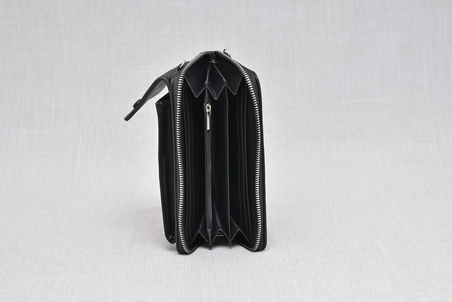 С едно отделение с три раздела, вътрешно джобче с цип и място за карти.