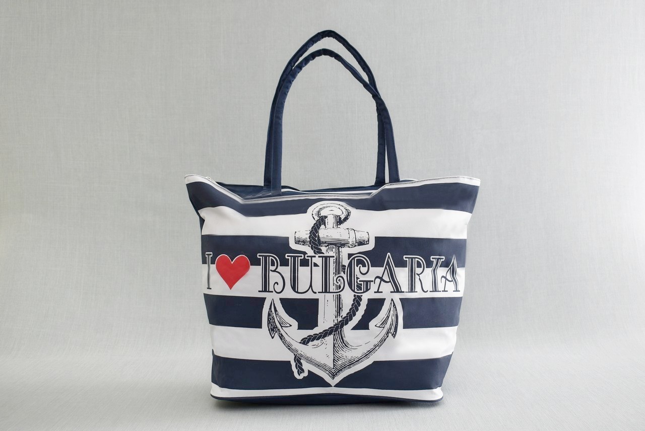 С красиви морски мотиви, някои са с надпис БЪЛГАРИЯ, има вътрешно джобче с цип.